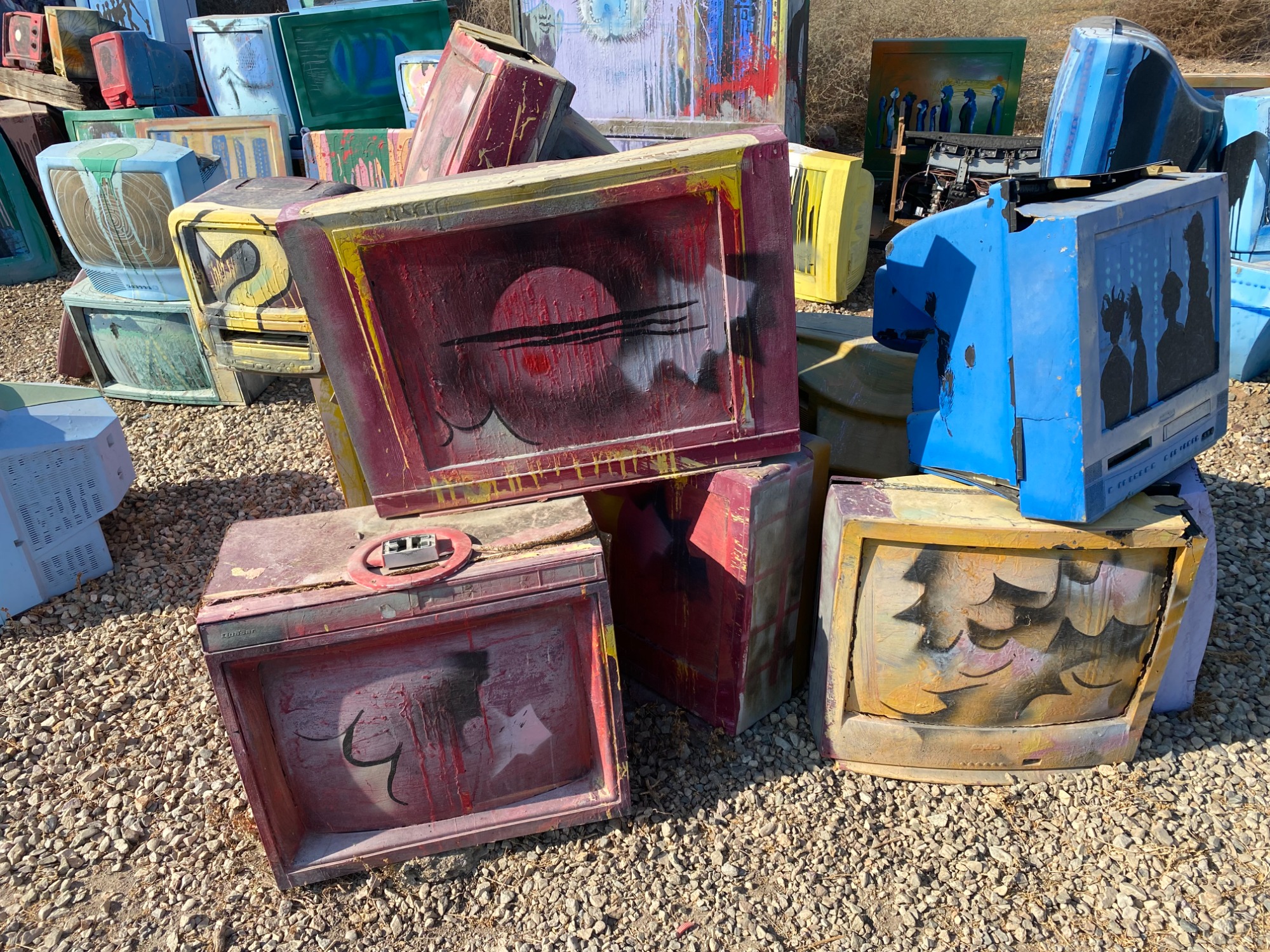Bombay Beach TVs is a permanent art installation by local artist Jack Parker and located on 4th Street in the town. The installation depicts dozens of painted scrap television sets. Some of the screens are painted with patterns, and others depicting landscapes, or faces.