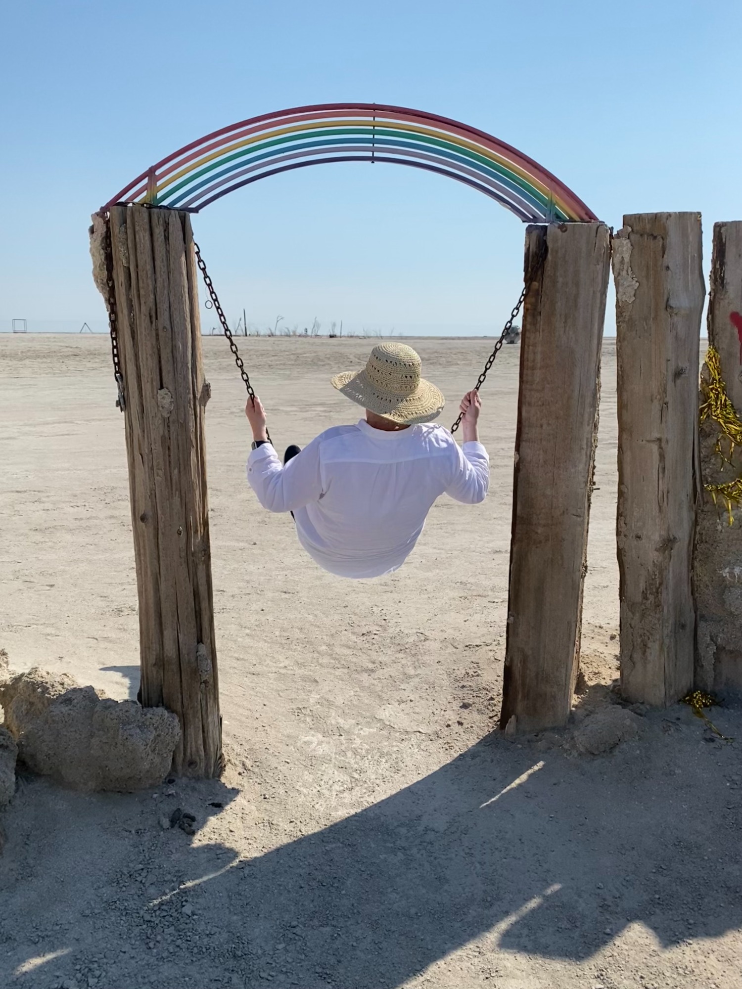 The Diva Station of the Sea features a set-up of a dining table made from salvaged wood with some chairs and a pink table cloth, with what looks like the remains of a pier as its backdrop. Two of the pier uprights have been made into a swing with a rainbow above it. It’s the perfect photo opportunity. That’s me on the swing, covered up in the searing heat.