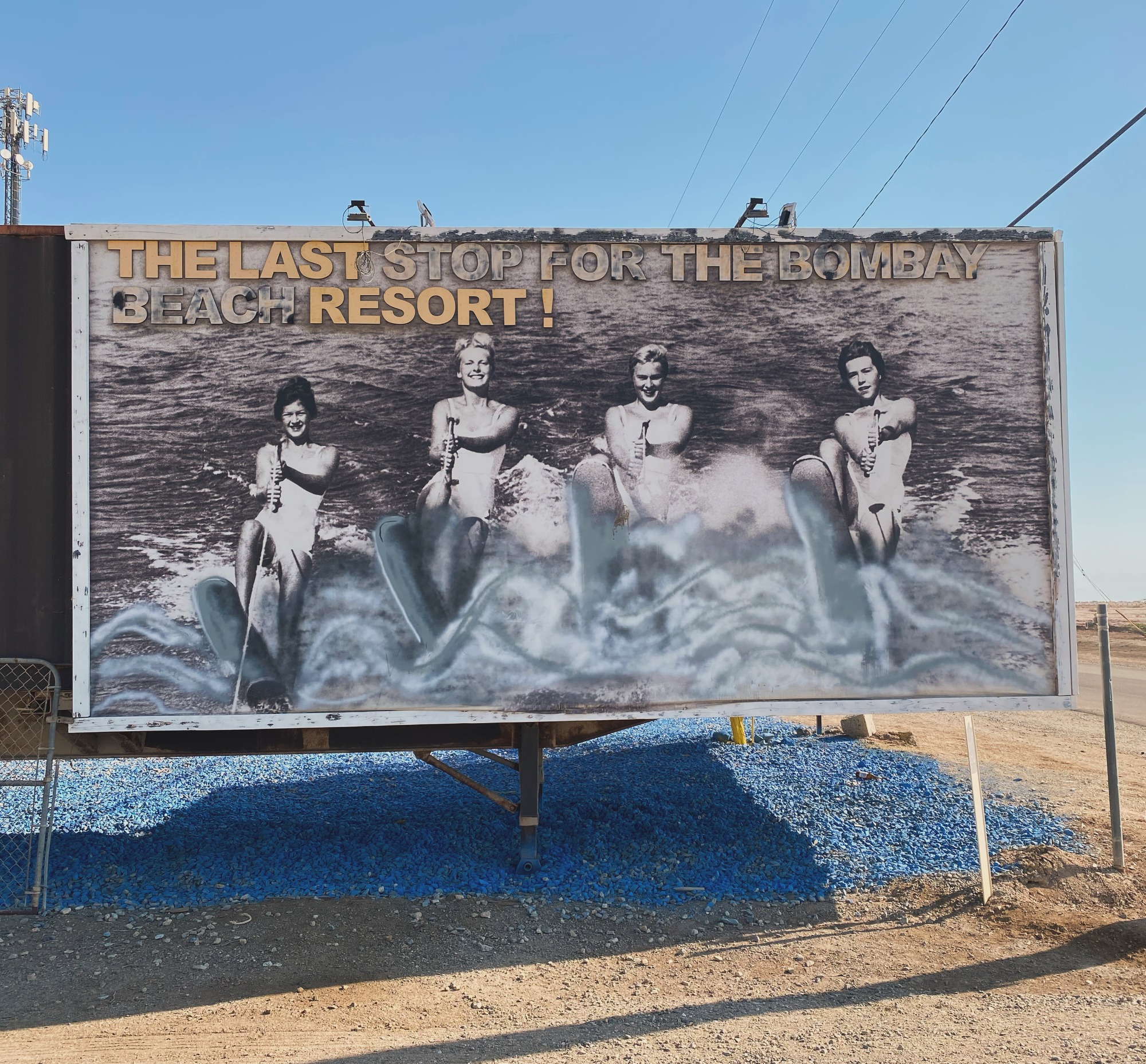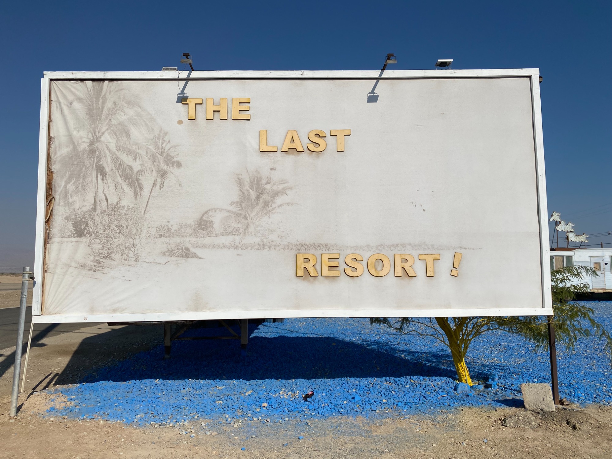 These two signs are near the entrance to Bombay Beach and are perpendicular to each other. They used to say “The Last Stop for the Bombay Beach Resort”, but the words in blue have faded. I think this was on purpose in order for the “The Last Resort” wording to seem dystopian.